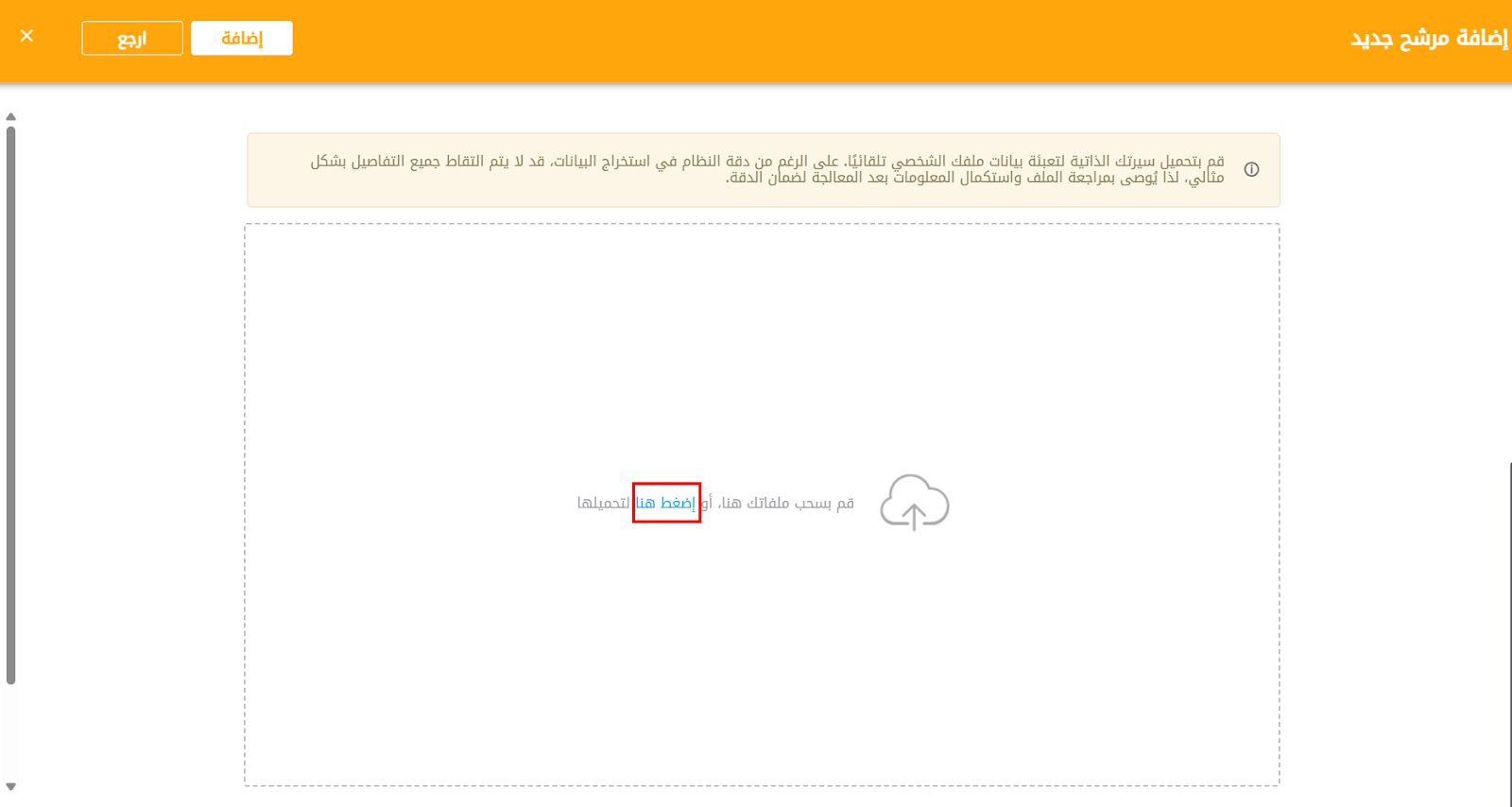 - تحميل السير الذاتية ((Upload CV(s): يسمح هذا الخيار لصاحب العمل بتحميل السير الذاتية واستيرادها إلى النظام. سيتم استخراج جميع البيانات وإضافتها إلى السيرة الذاتية.