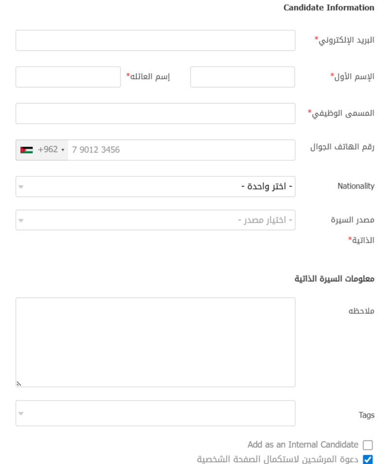 - الإضافة اليدوية (Add Manually): عن طريق ملء المعلومات الأساسية (عنوان البريد الإلكتروني، الاسم الأول، اسم العائلة، المسمى الوظيفي، الهاتف المحمول، المصدر، الجنسية، الملاحظات، والعلامات) وإضافة المرشح إلى بوابة الوظائف.