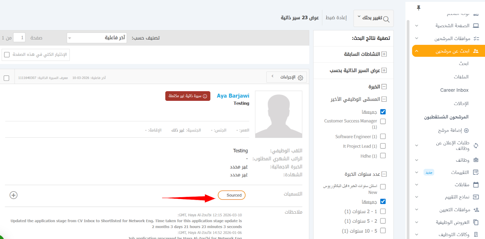 - علامة النظام: ستتم إضافة علامة "Sourced" (مورَّد) إلى السيرة الذاتية.
