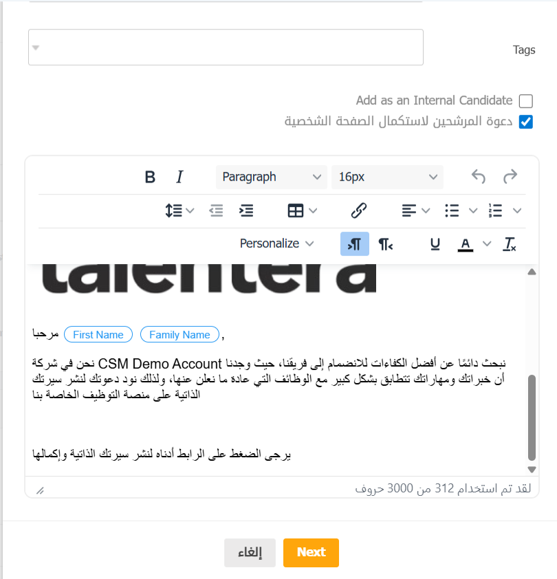 سيتم استخراج المعلومات الأساسية وتعبئتها مسبقًا في النافذة المنبثقة. سيكون لدى صاحب العمل أيضًا خيار دعوة المرشح لإكمال ملفه الشخصي.