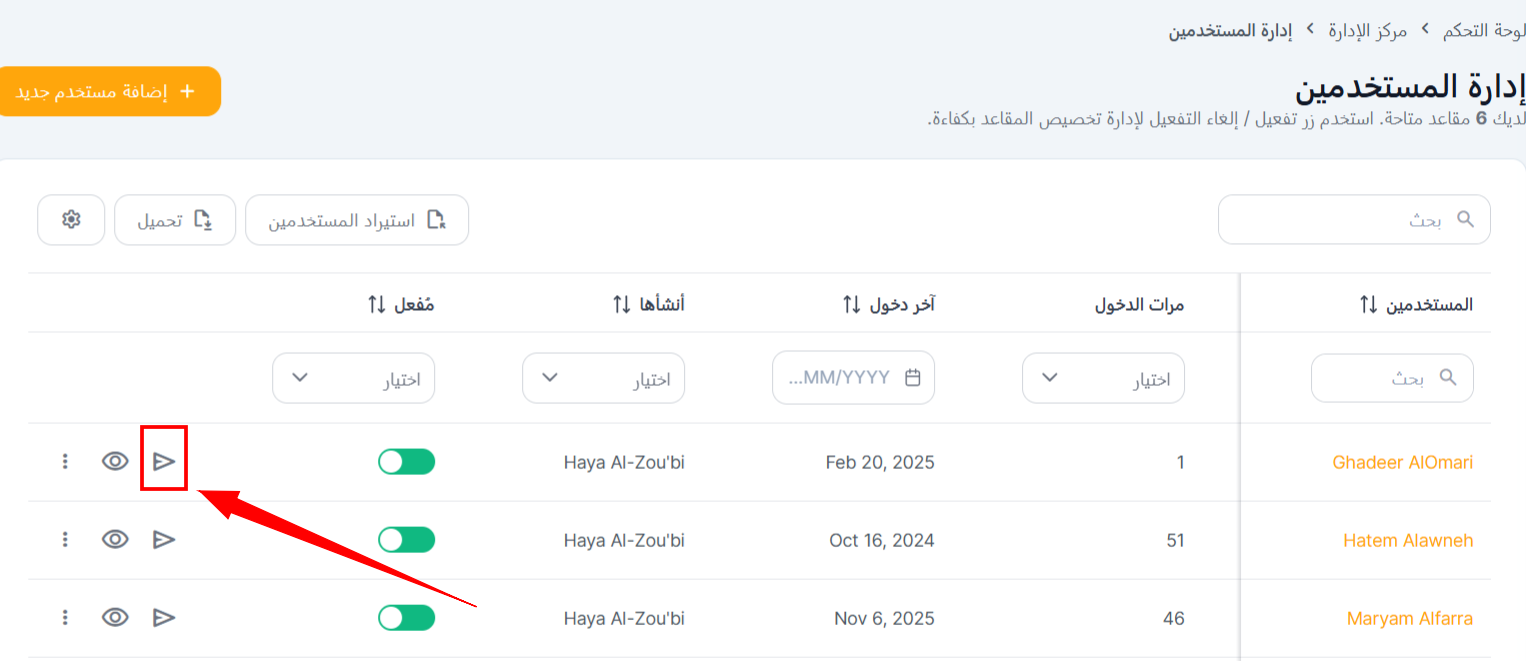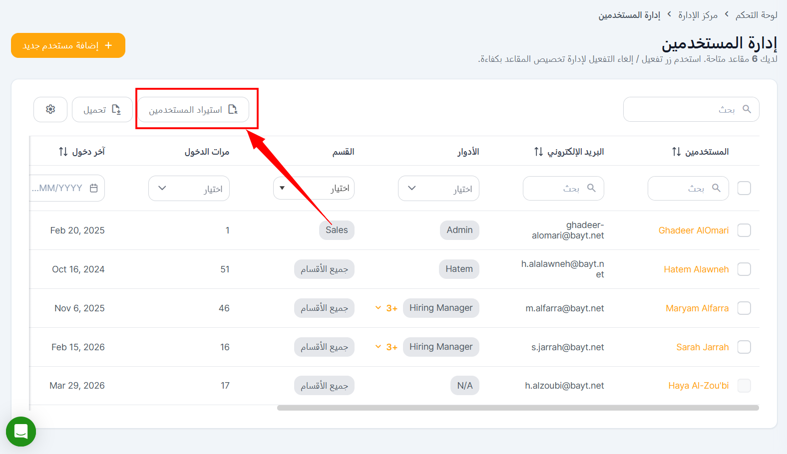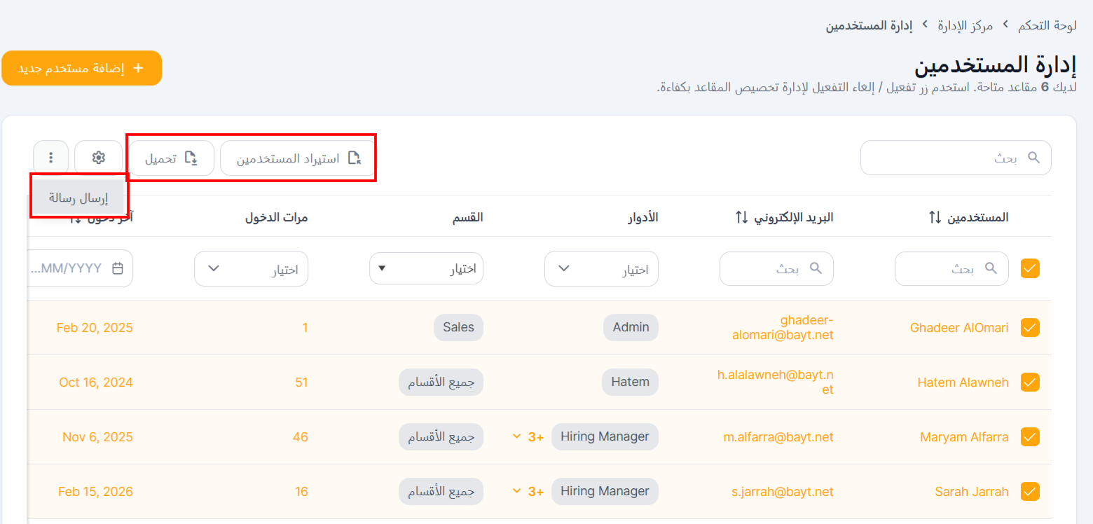 - الاستيراد - عن طريق تحميل ملف CSV وإضافة المستخدمين، ثم استيرادهم إلى بوابة التوظيف دفعة واحدة.