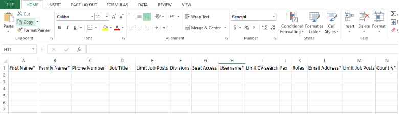 يحتوي ملف القالب على الأعمدة التالية: الاسم الأول / اسم العائلة، رقم الهاتف، المسمى الوظيفي، حد نشر الوظائف / البحث في السير الذاتية على بيت.كوم، اسم المستخدم، البلد / المدينة، الفاكس، الأدوار، الأقسام، والوصول إلى المقعد (Seat Access).