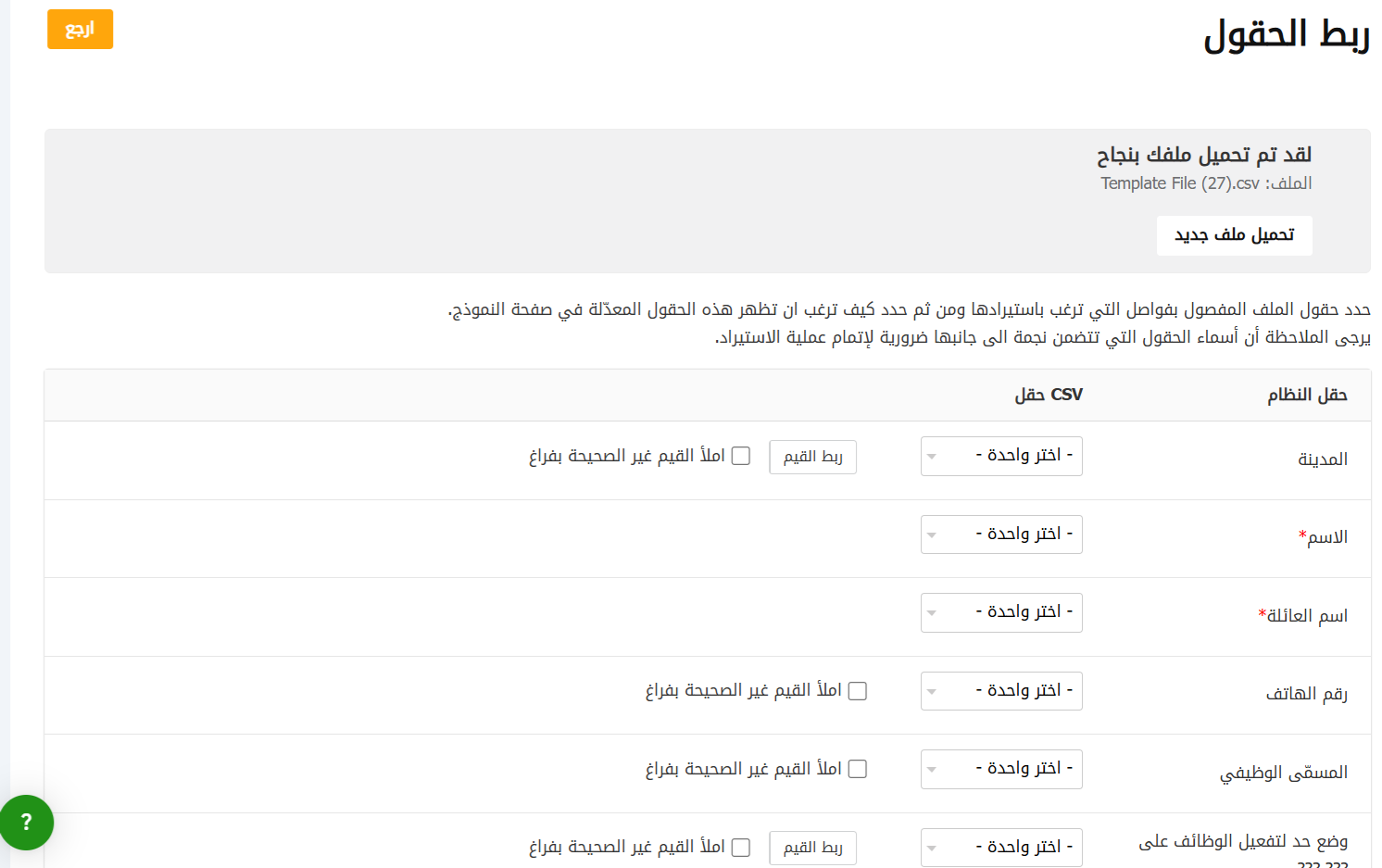بعد تحميل ملف CSV، تحتاج إلى مطابقة القيم الموجودة في ملف CSV مع حقول النظام.