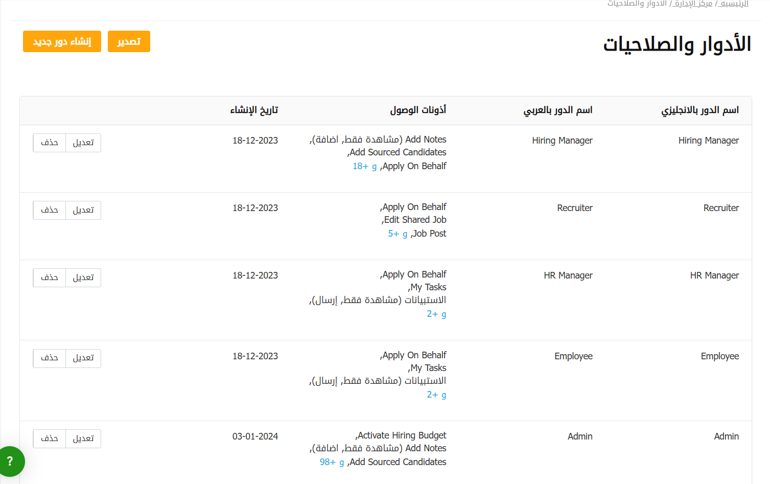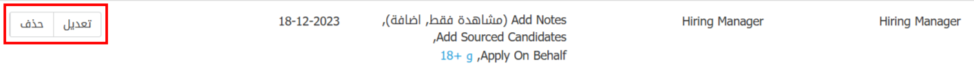 يتم فرز الأدوار بناءً على تاريخ الإنشاء، ويمكنك تنفيذ الإجراءات التالية لكل دور: