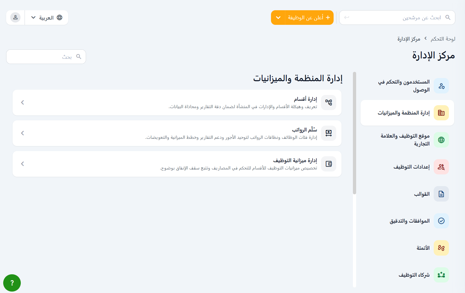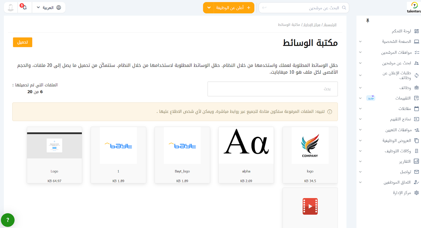 توفر مكتبة الوسائط مساحة مركزية لتحميل وتنظيم وإدارة جميع ملفات الوسائط اللازمة لسير عمل التوظيف الخاص بك. تتيح لك هذه الميزة تخزين عناصر مثل الصور والمستندات ووسائط أخرى، ثم إعادة استخدامها بسهولة عبر النظام.