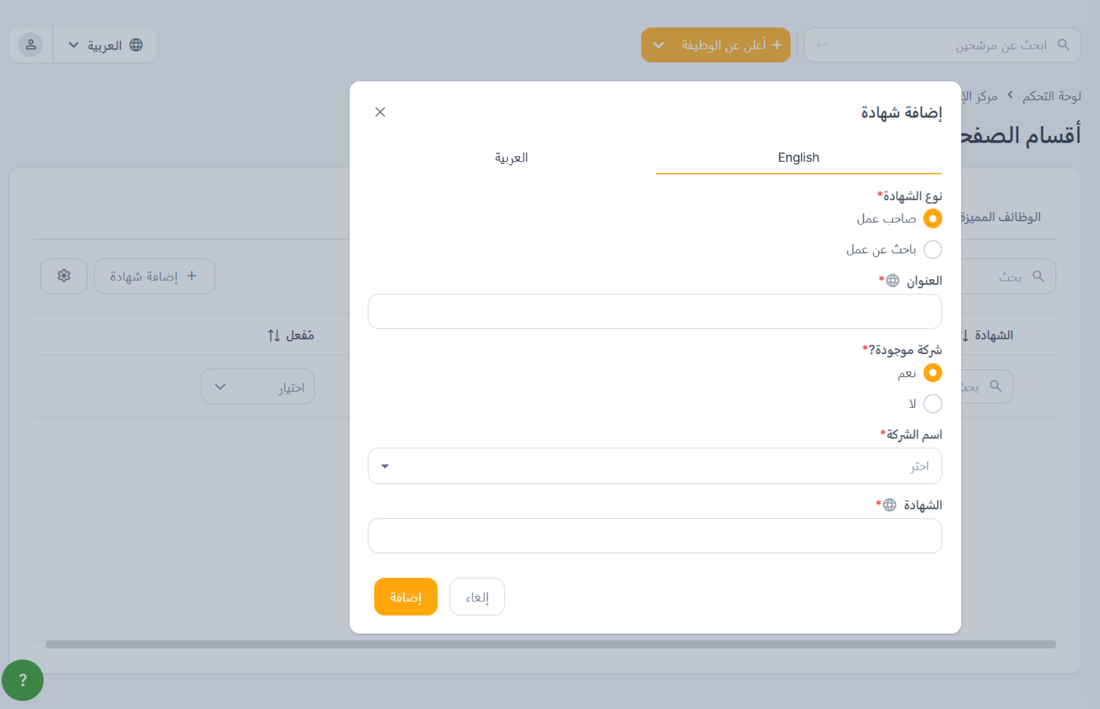 قم بتكوين وترتيب الأقسام المعروضة على الصفحة الرئيسية لموقع التوظيف، مثل الوظائف المميزة (Featured jobs)، اراء المستخدمين (Testimonials)، والأخبار.