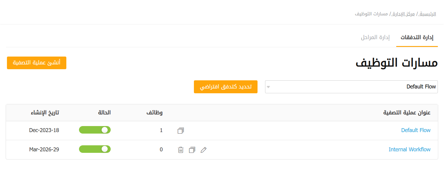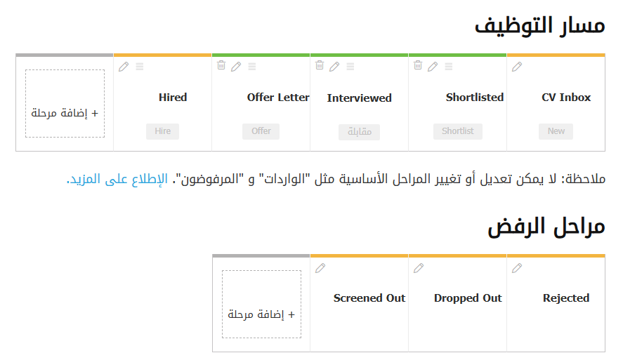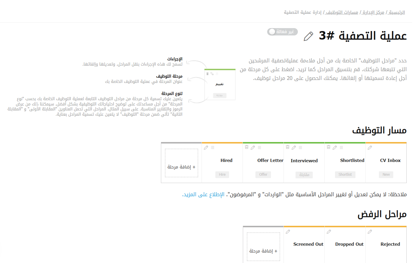 لا يمكن تغيير المراحل الافتراضية مثل "صندوق الوارد" (Inbox) و"مرفوض" (Rejected) في المسار. مرحلة صندوق الوارد هي المرحلة الأولى التي ستظهر فيها السيرة الذاتية بعد تقديم المرشح.