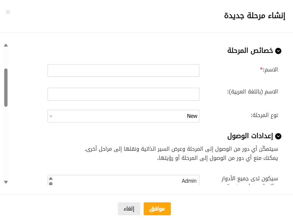 - وصول محدود - حدد الأدوار التي ستتمكن من الوصول إلى المرحلة.