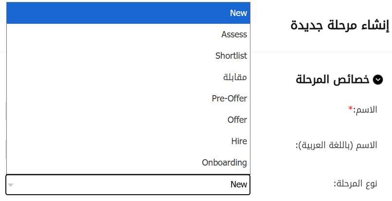 - نوع المرحلة - يساعد استخدام نوع المرحلة في إظهار الأيقونات المناسبة والتقارير الهادفة. على سبيل المثال، المراحل مثل "مقابلة الجولة 1" و"مقابلة الجولة 2" تندرج تحت نوع مرحلة "مقابلة" ويجب وضع علامات عليها وفقًا لذلك.