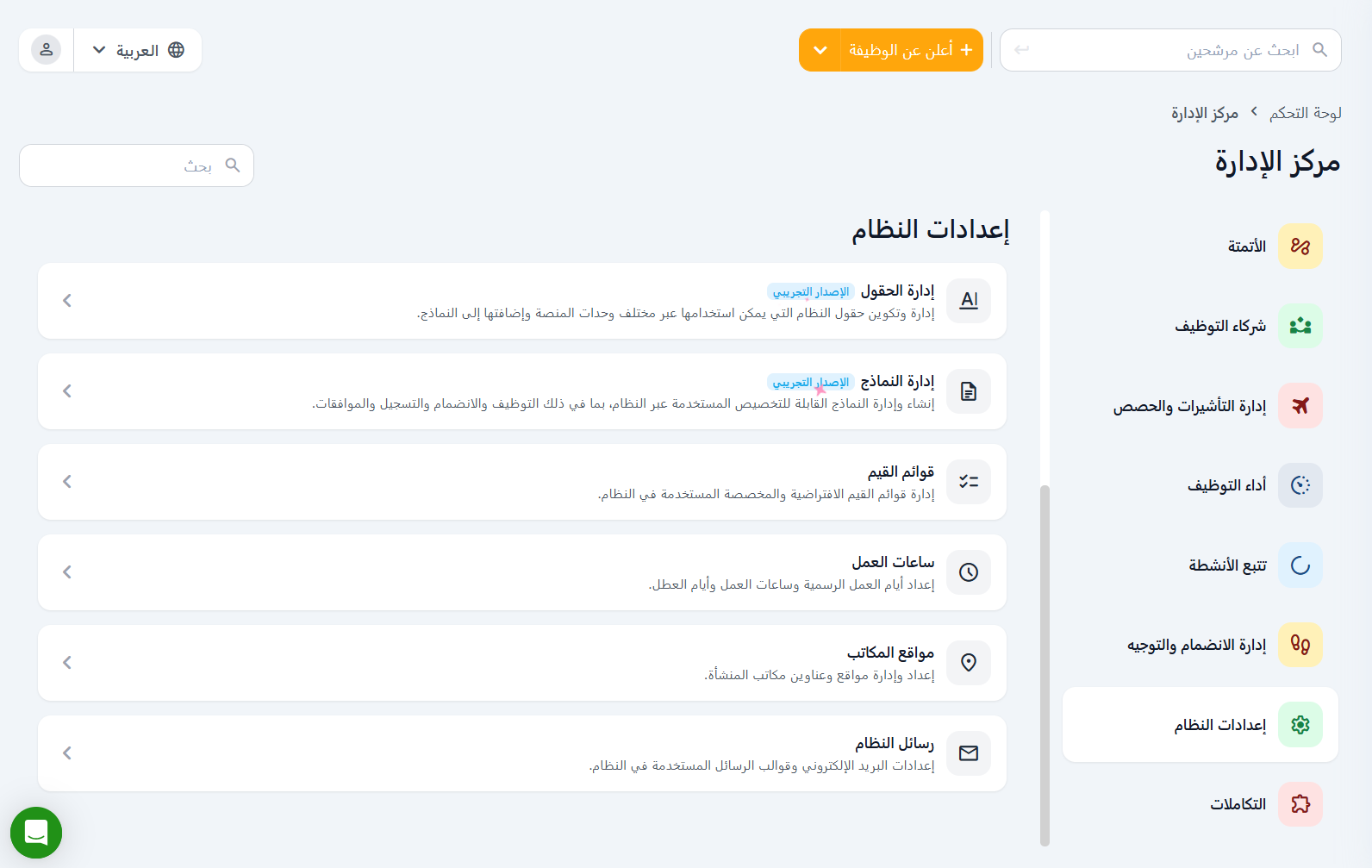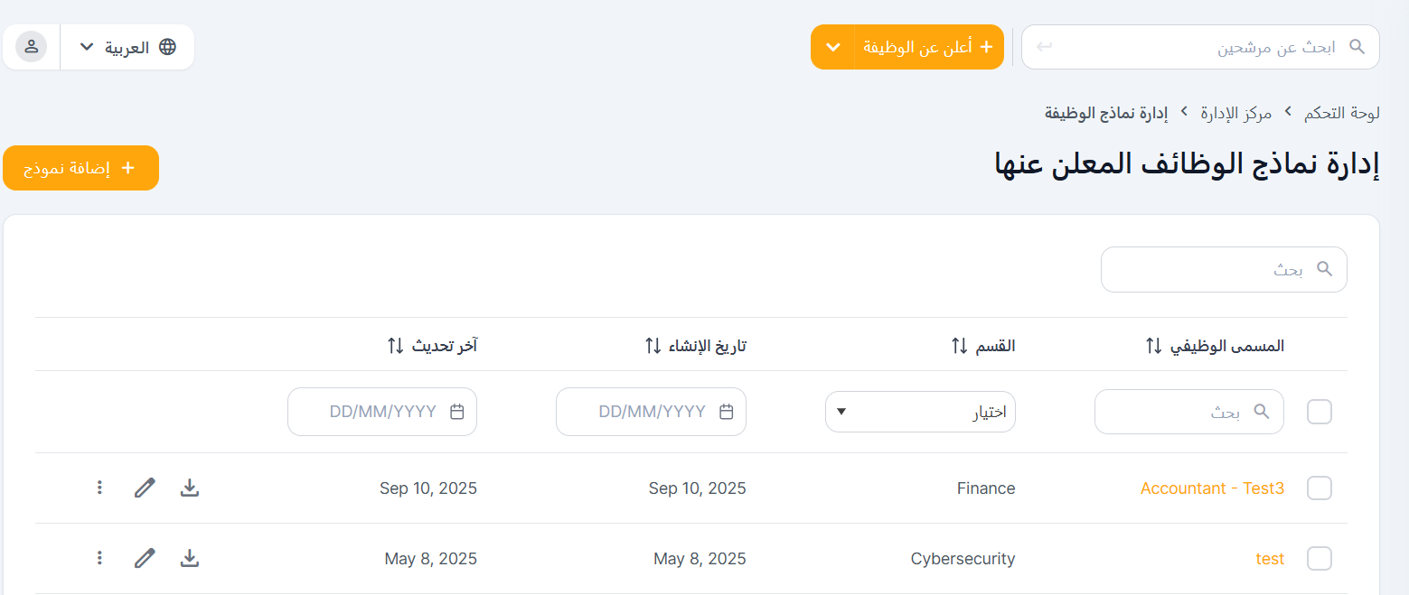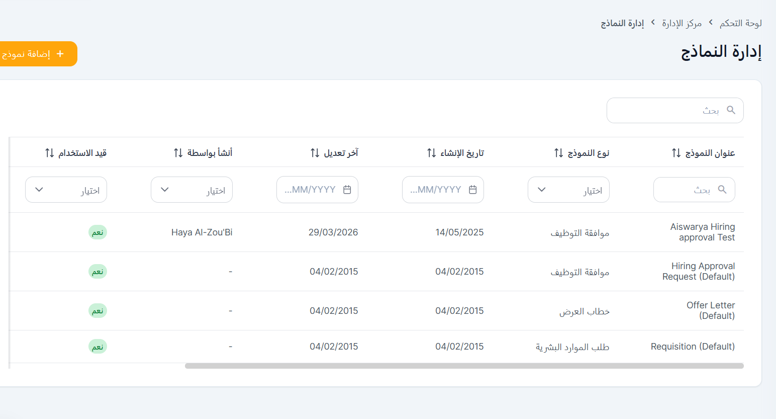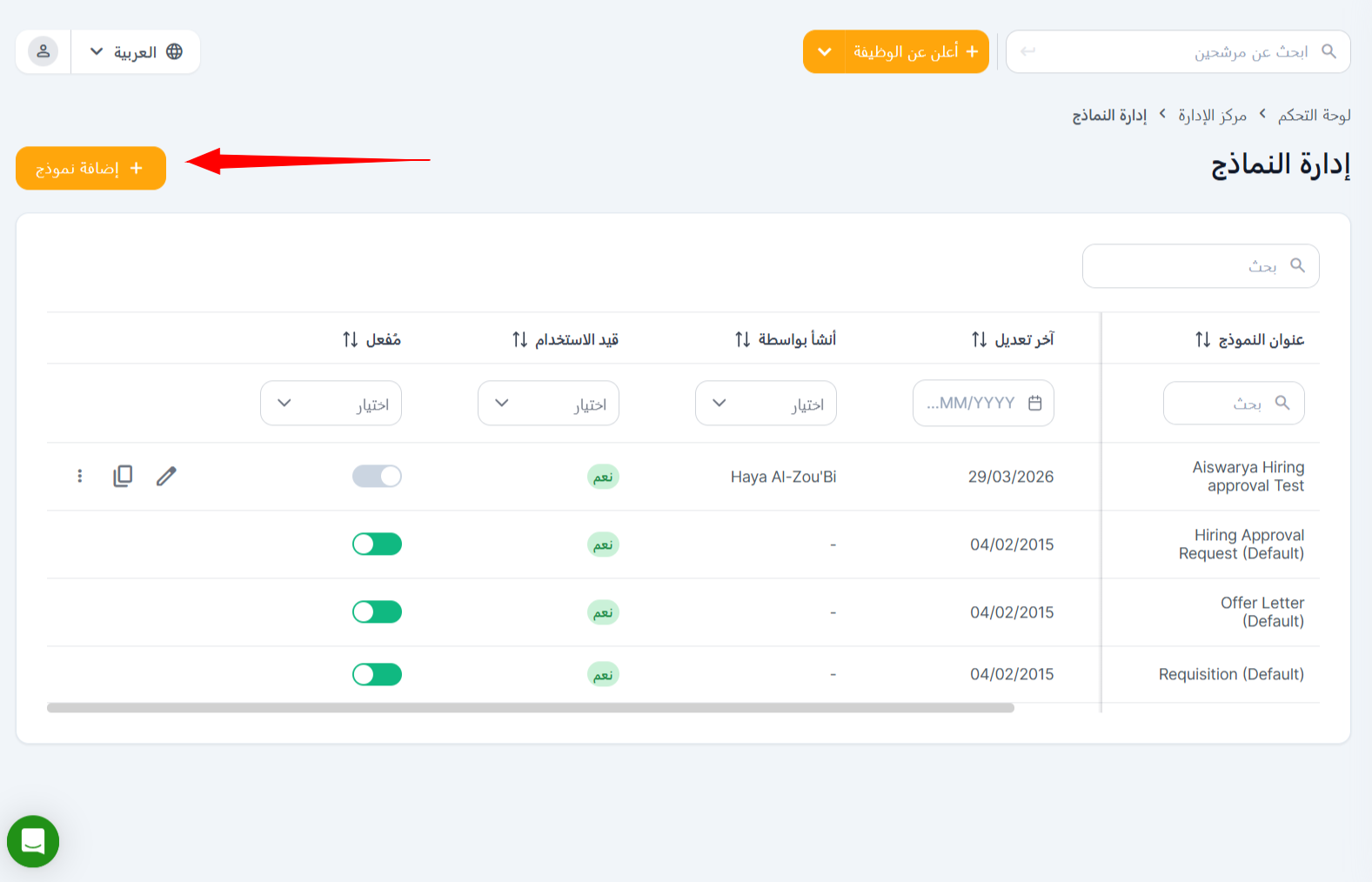 يسمح لك قسم إدارة النماذج بإنشاء وإدارة وتنظيم نماذج مختلفة تستخدم خلال عملية التوظيف. يشمل هذا نماذج مثل:
