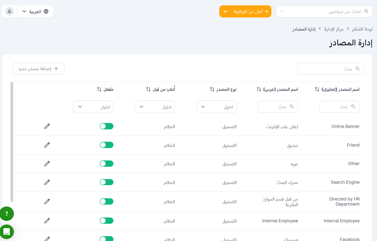 اجمع إحصائيات حول مصادر تسجيل الباحثين عن عمل وسيرهم الذاتية، وقم بإدارة جميع المصادر باستخدام هذه الصفحة.