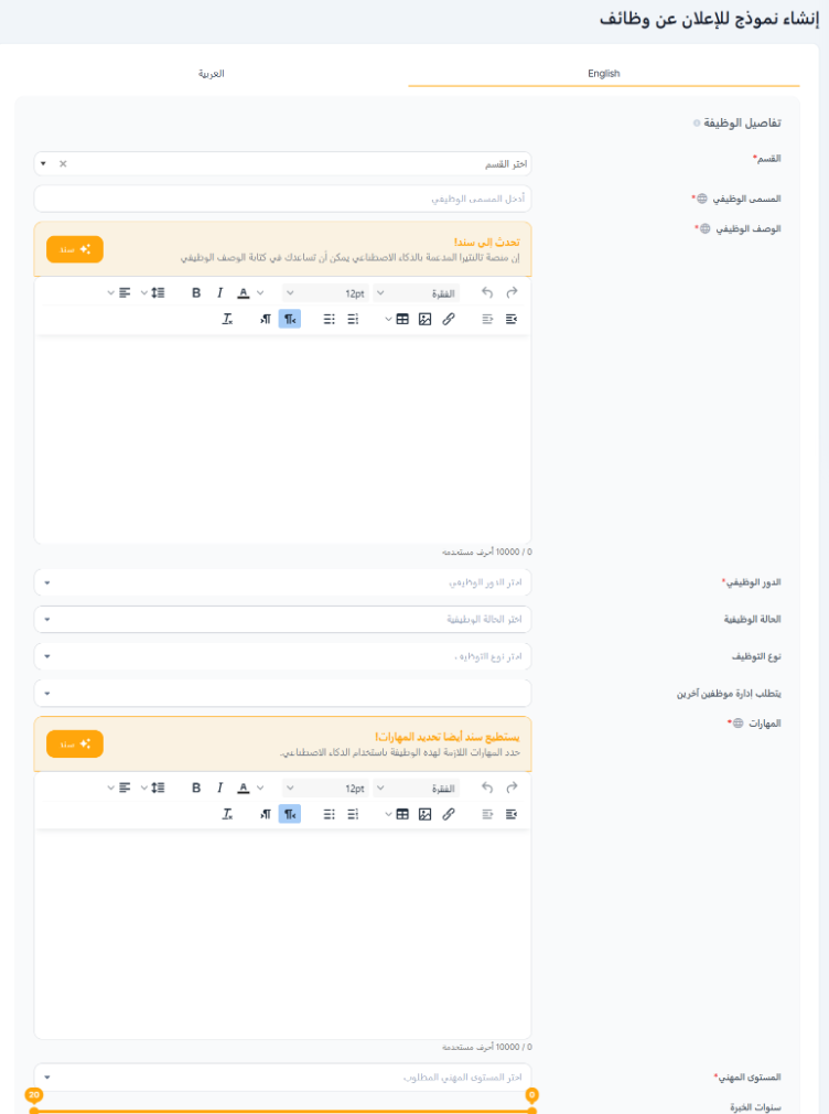 أضف تفاصيل الوظيفة الأساسية والواجبات والمسؤوليات، وقم بتخصيصها بناءً على أهداف مؤسستك. ثم قم بتحميلها بسهولة لاحقًا عند نشر وظيفة.