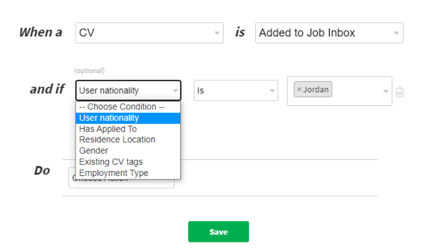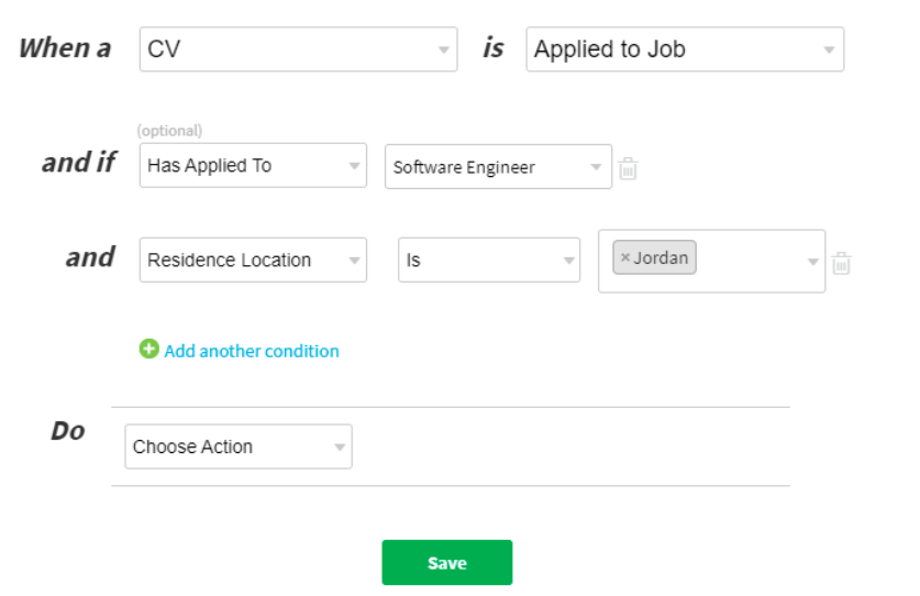 لذا، إذا قمت، على سبيل المثال، بنشر وظيفة وتريد استبعاد جميع المرشحين الذين يعيشون في الأردن تلقائيًا لتلك الوظيفة المحددة وإرسال بريد إلكتروني اعتذار إليهم بعد يومين، يمكنك القيام بما يلي: