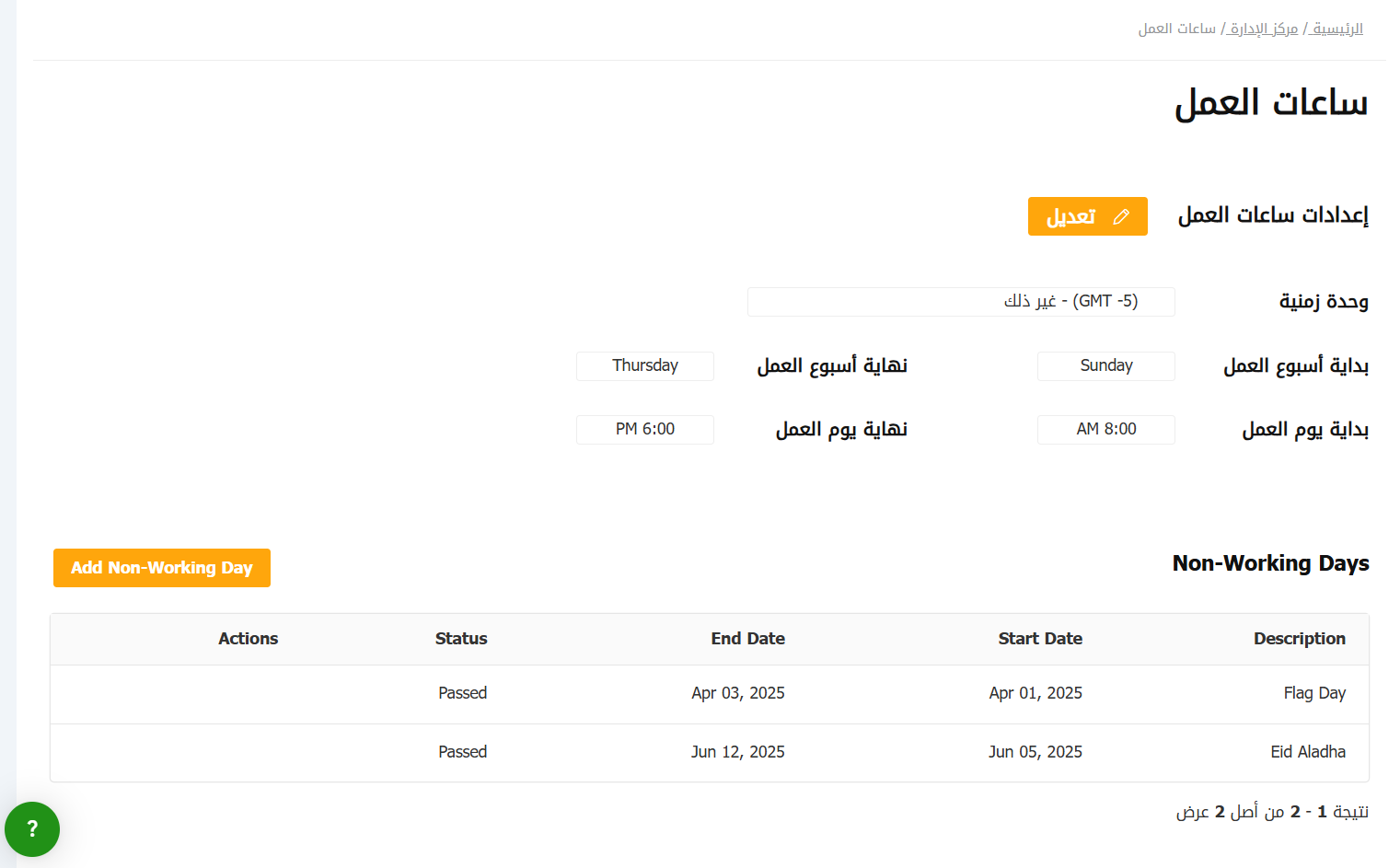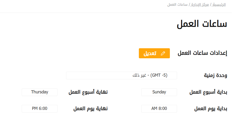 قم بتكوين أيام عملك وساعات عملك بالإضافة إلى القدرة على إدارة أيام عطلاتك (نهايات الأسبوع والأعياد).
