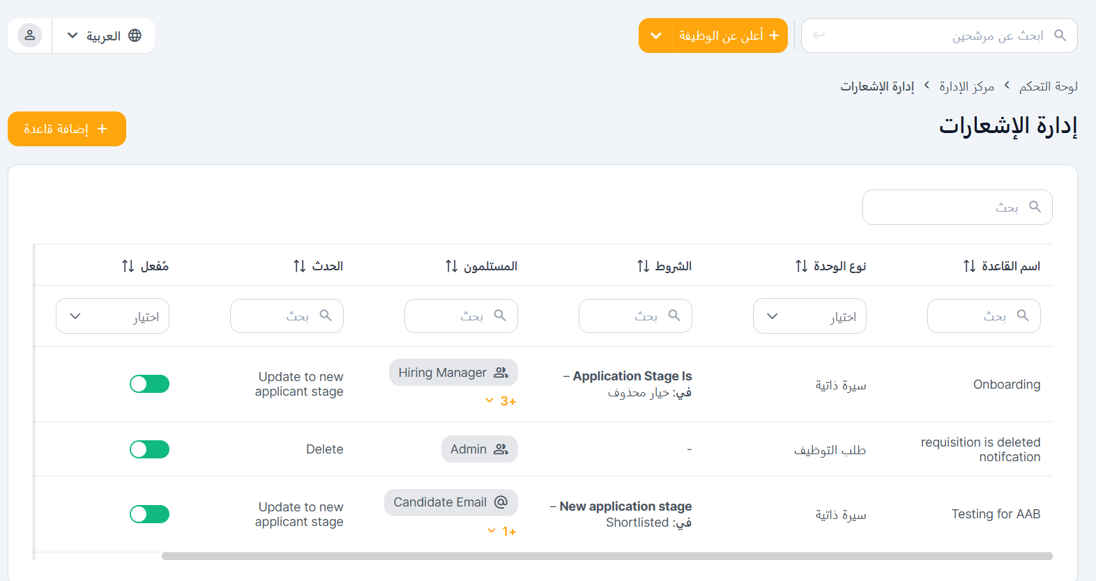 تسمح لك منصة Talentera بتبسيط التواصل من خلال قواعد الإشعارات المؤتمتة. تُمكّن هذه الميزة مستخدمي النظام من إنشاء وإدارة القواعد التي تشغل الإشعارات تلقائيًا بناءً على شروط محددة مسبقًا. من خلال القيام بذلك، فإنك تضمن تحديثات في الوقت المناسب، وتقليل الجهد اليدوي، وزيادة الكفاءة في جميع مراحل سير عمل التوظيف الخاص بك.