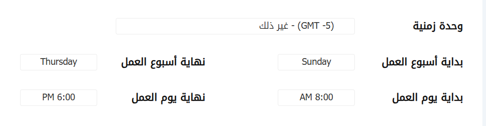 يمكنك أيضًا تحديد ساعات العمل عن طريق ملء "يبدأ يوم العمل في" (Work Day Starts at) و "ينتهي يوم العمل في" (Work Day End at).