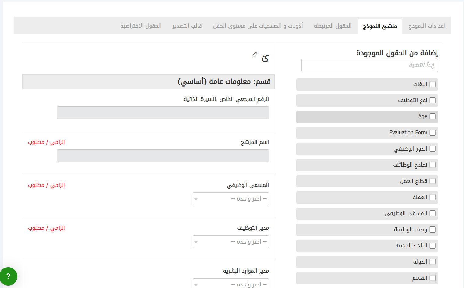 بعد النقر على حفظ الإعدادات، سيتم نقلك إلى مُنشئ النماذج. في هذه الخطوة، يمكنك إنشاء نموذجك عن طريق الاختيار من الحقول الموجودة في النظام أو إضافة حقول مخصصة لالتقاط معلومات إضافية. يسمح لك مُنشئ النماذج بتصميم هيكل النموذج وفقًا لاحتياجات التوظيف المحددة الخاصة بك قبل الانتهاء منه ونشره.