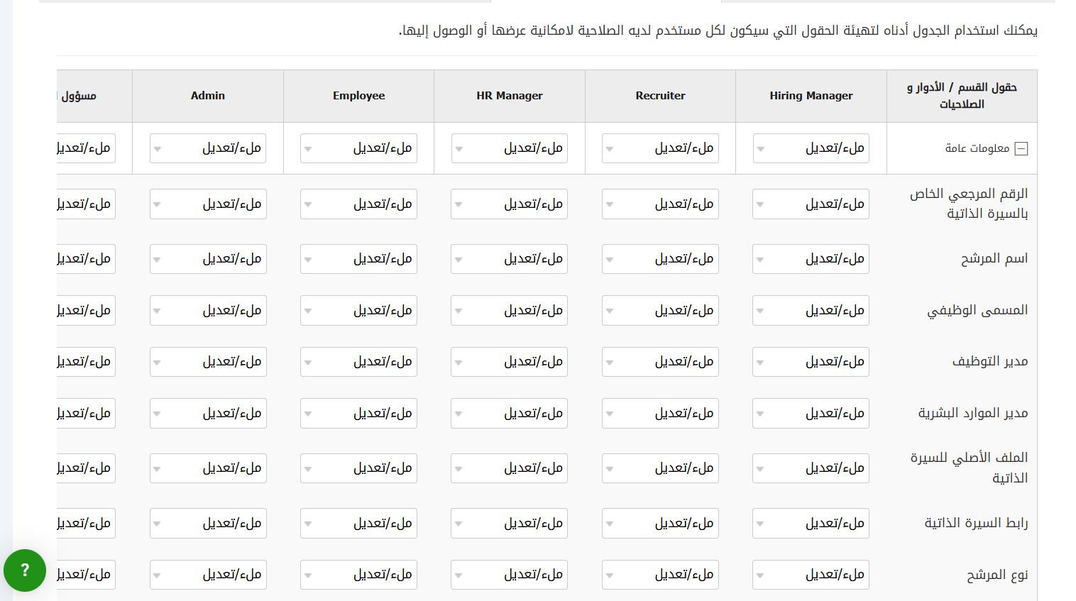 يمكنك استخدام الجدول أعلاه لتكوين الحقول التي سيتمتع كل دور مستخدم بإمكانية عرضها أو ملئها.