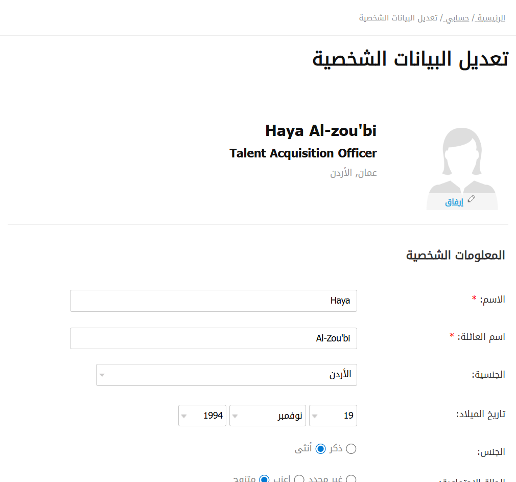 قسم المعلومات الشخصية (Personal Information section): يحتوي على الحقول التالية: