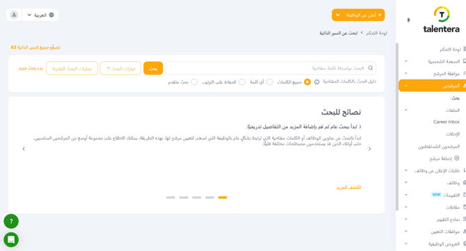 يمكن لأصحاب العمل استخدام واجهة البحث عن السير الذاتية للعثور على المرشحين الأنسب من مجمع المواهب الواسع لديهم. قم بالتصفية باستخدام أكثر من 30 معيارًا للوصول إلى المرشحين الأكثر صلة على الفور.