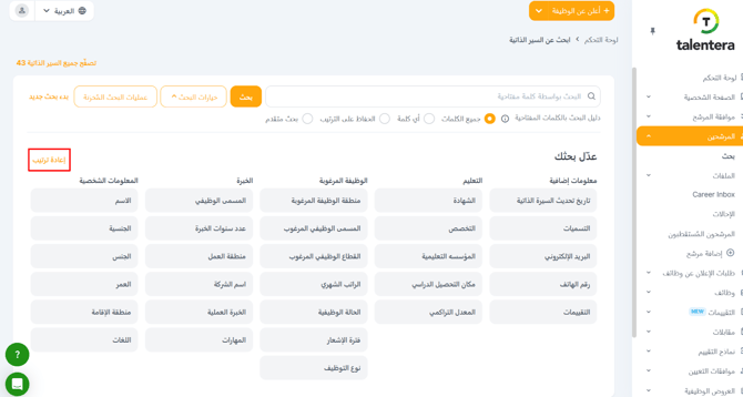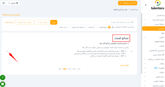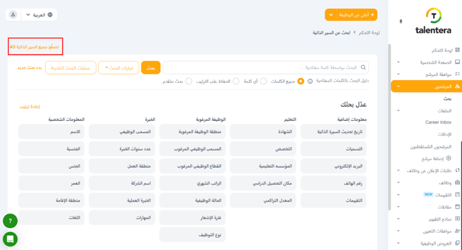 تحمل السيرة الذاتية لكل مرشح رمزًا مرجعيًا فريدًا. يمكنك البحث عن سيرة ذاتية أو مرشح معين عن طريق إدخال هذا الرمز في حقل نص الكلمات الرئيسية.