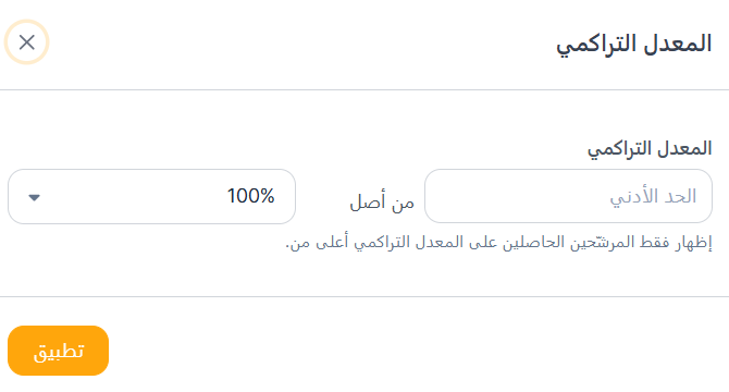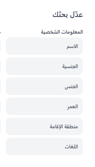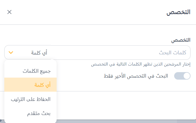 يسمح لك فلتر التخصص بالبحث عن المرشحين بناءً على مجال دراستهم أو تخصصهم. يمكنك إدخال كلمات رئيسية في مربع البحث والاختيار من خيارات مثل أي كلمات، جميع الكلمات، تطابق تام، أو بحث بولياني للحصول على نتائج أكثر دقة. بالإضافة إلى ذلك، يوجد مفتاح لـ البحث ضمن التخصص الأحدث فقط، مما يساعدك على التركيز على أحدث التخصصات الأكاديمية للمرشحين.