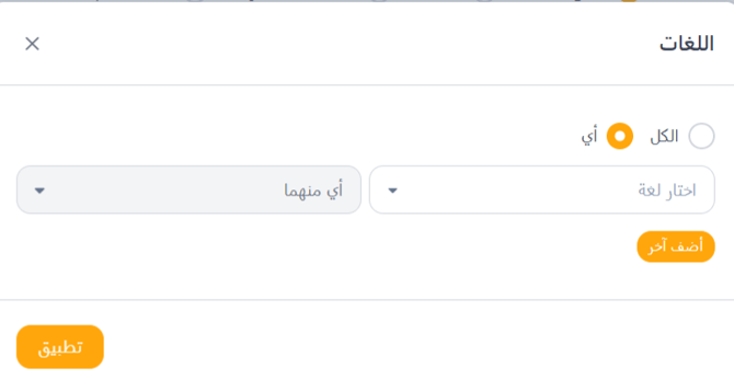يسمح لك فلتر اللغات بالبحث عن المرشحين بناءً على مهاراتهم اللغوية. يمكنك تحديد لغة معينة وتحديد مستوى الكفاءة المطلوب (مبتدئ، متوسط، خبير، أصلي، أو أي). يمكنك اختيار أحد الخيارات التالية: