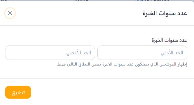 2- سنوات الخبرة (Years of Experience): استخدم هذا الفلتر لتحديد الحد الأدنى والحد الأقصى لسنوات الخبرة المهنية الإجمالية. يحتوي على فلاتر لكل من قائمة الحد الأدنى وقائمة الحد الأقصى.