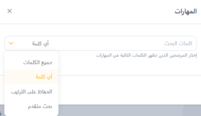 يساعدك فلتر المهارات على تضييق نطاق المرشحين بناءً على مهارات محددة. يمكنك كتابة كلمات رئيسية في شريط البحث للبحث عن مهارات معينة تتطابق مع متطلبات وظيفتك.