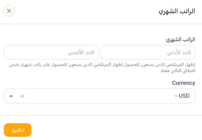 يسمح لك فلتر نطاق الراتب الشهري بتنقيح البحث عن طريق تحديد نطاق الراتب المتوقع للمرشح. يمكنك تعيين كل من الحد الأدنى و الحد الأقصى للقيم لتتناسب مع متطلبات ميزانيتك.