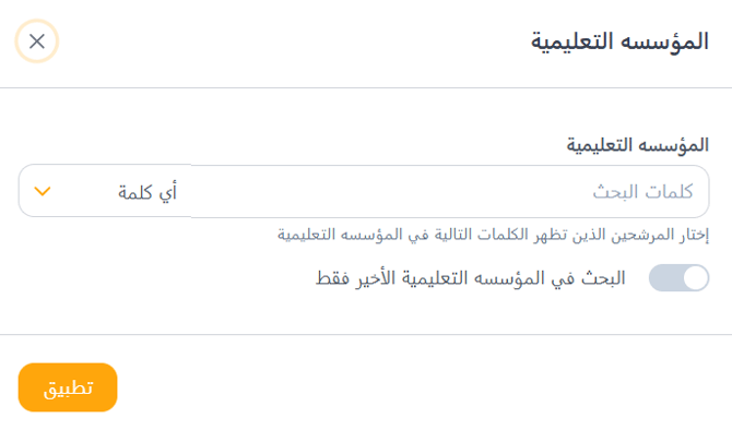 يسمح لك فلتر المؤسسة التعليمية بالبحث عن المرشحين بناءً على المؤسسة التعليمية التي التحقوا بها. يمكنك إدخال كلمات رئيسية في مربع البحث واستخدام خيارات مثل أي كلمات، جميع الكلمات، تطابق تام، أو بحث متقدم لتنقيح النتائج. يساعدك هذا الفلتر على استهداف المرشحين من مدارس أو كليات أو جامعات محددة تتوافق مع متطلبات التوظيف الخاصة بك. بالإضافة إلى ذلك، يوجد مفتاح لـ البحث ضمن المؤسسة الأحدث فقط، مما يساعدك على التركيز على أحدث الخبرات الأكاديمية للمرشحين.