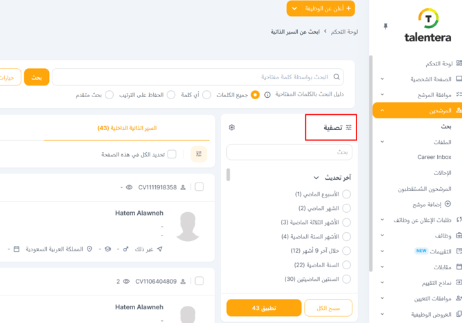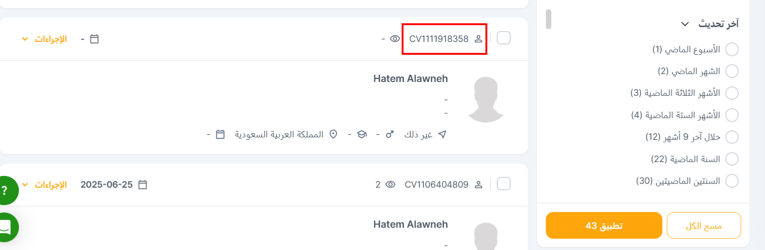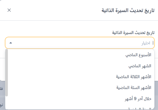 يمكنك اختيار السير الذاتية التي تم تحديثها مؤخرًا، حتى تعرف أن المرشح يبحث حاليًا عن عمل أو منفتح على الفرص.