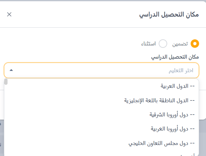 - تضمين (Include): يسترد المرشحين الذين درسوا في البلد أو البلدان المحددة.