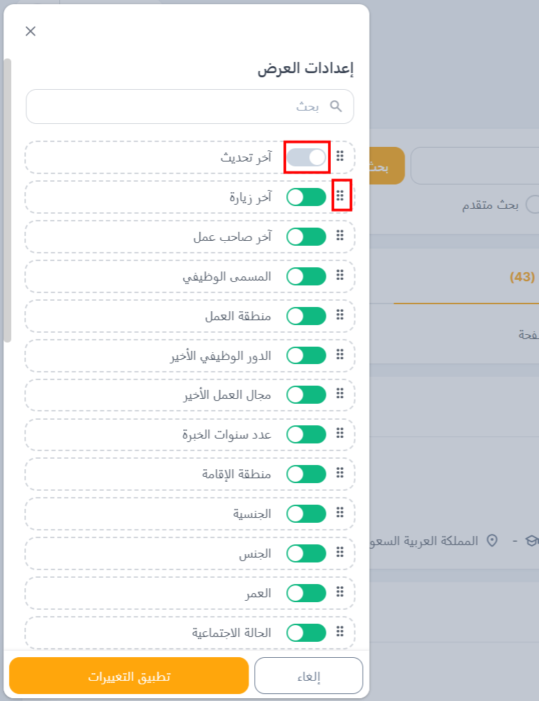 يمكنك تنظيم قسم القائمة المختصرة بالنقر على الزر الموضح أدناه. ومن هناك، يمكنك تمكين أو تعطيل فلاتر محددة، بالإضافة إلى سحب وإسقاط كل فلتر لإعادة ترتيبها بناءً على أهميتها وصلتها بعملية التوظيف الخاصة بك.