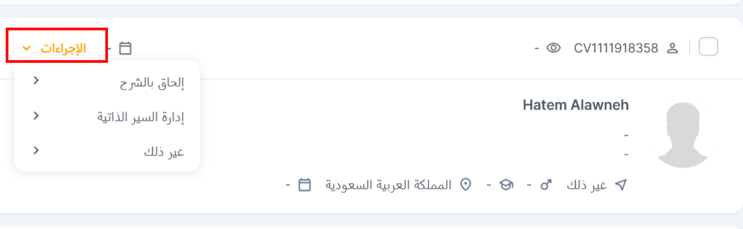 تحتوي كل نبذة عن سيرة ذاتية في هذا العرض على زر مسمى إجراءات (Actions) يسمح لصاحب العمل باتخاذ إجراءات مختلفة على السيرة الذاتية: