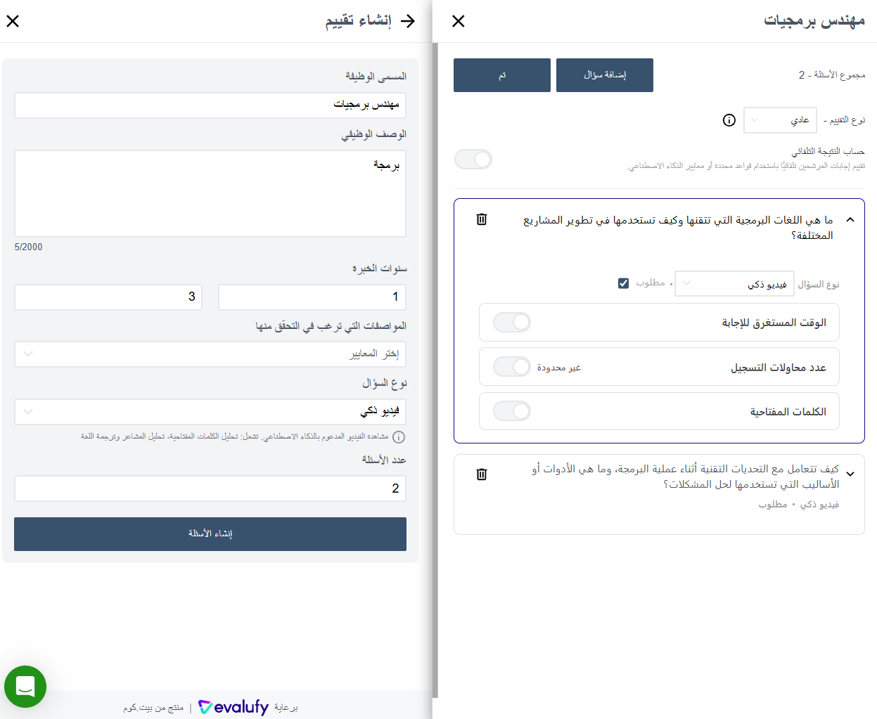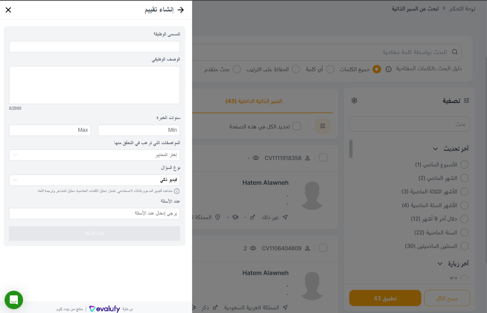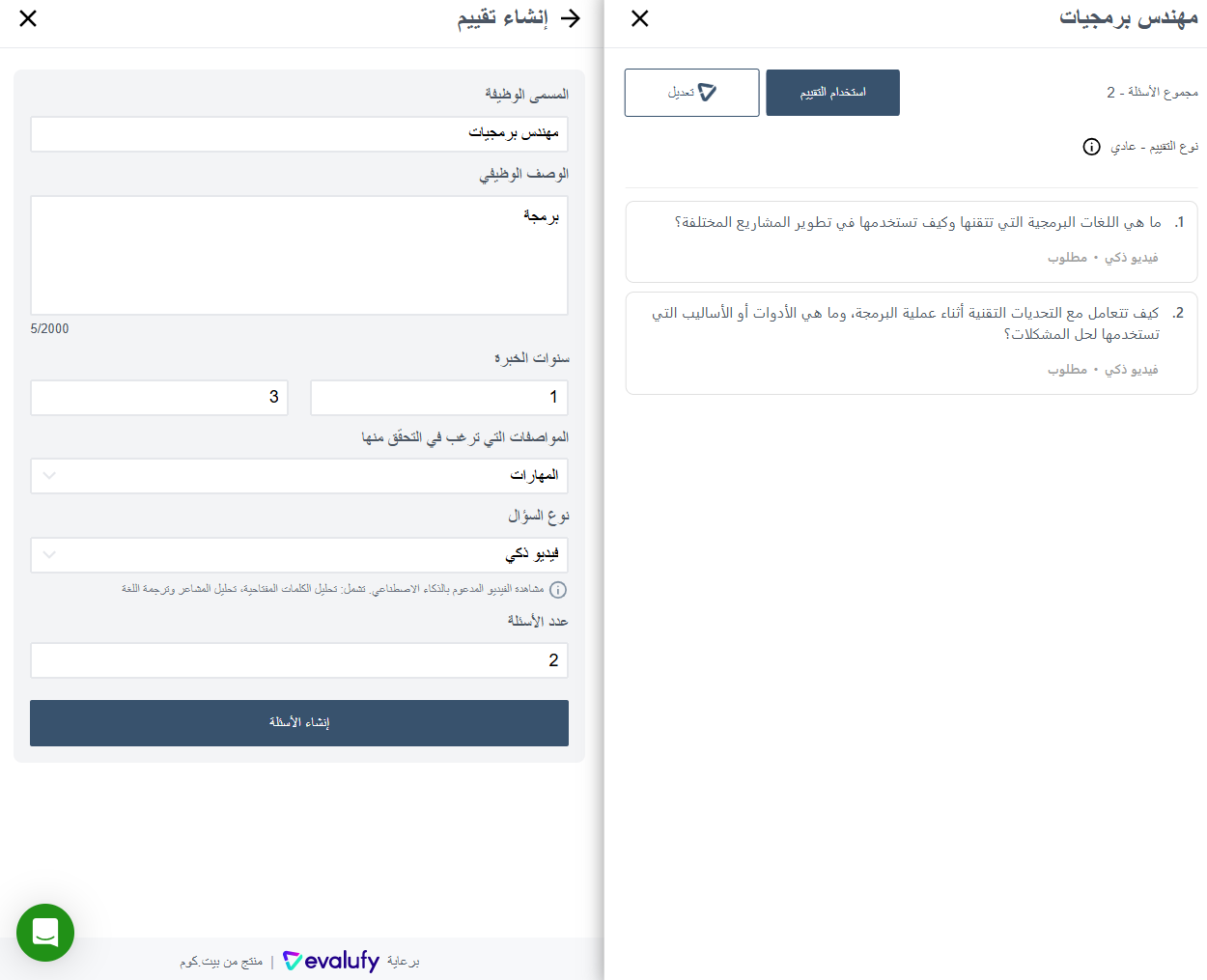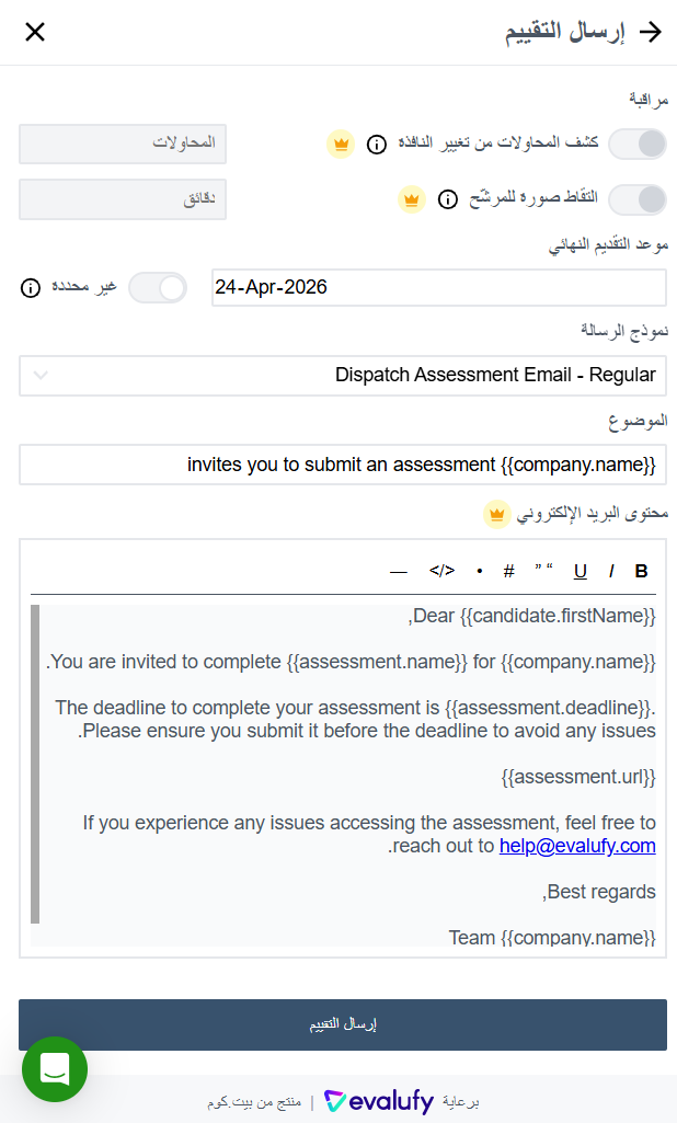 - **إرسال تقييم** (Send Assessment): يمكن لأصحاب العمل إرسال ****تقييمات محددة مسبقًا** **من خلال أداة Evalufy أو إنشاء **تقييم مخصص**. لإنشاء تقييم مخصص، ما عليك سوى إدخال **المسمى الوظيفي، الوصف الوظيفي، سنوات الخبرة**، وتحديد **السمات المراد التحقق منها** (المهارات، الشخصية، والكفاءة). بعد ذلك، اختر **أنواع الأسئلة**، والتي تشمل:
