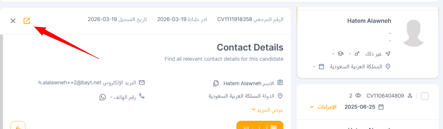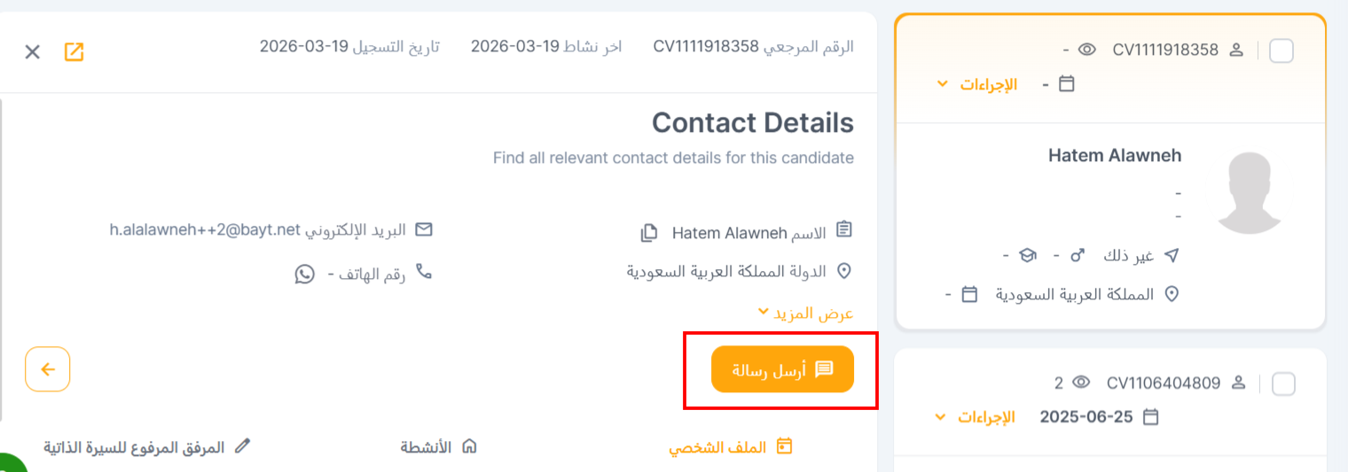 - عرض تفاصيل الاتصال (View Contact Details): يسمح هذا الزر لأصحاب العمل بالوصول السريع إلى معلومات الاتصال بالمرشح، بما في ذلك أرقام الهواتف وعناوين البريد الإلكتروني، مما يسهل الاتصال المباشر بالنقر على "إرسال رسالة".