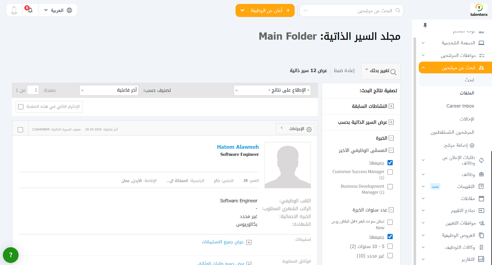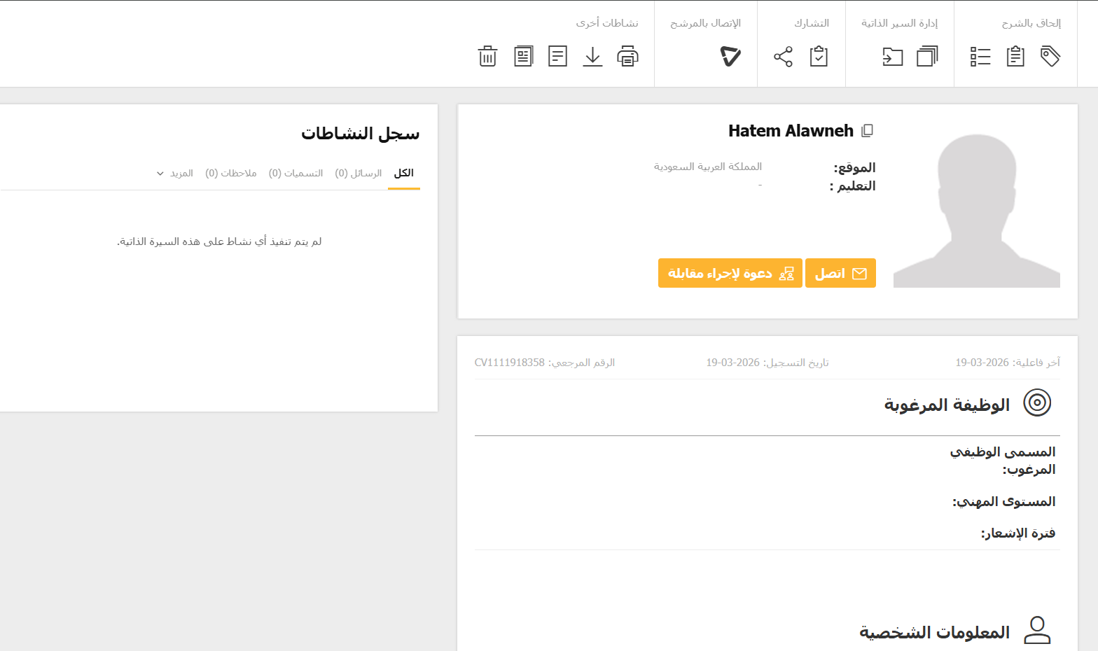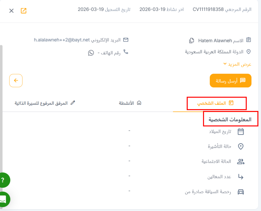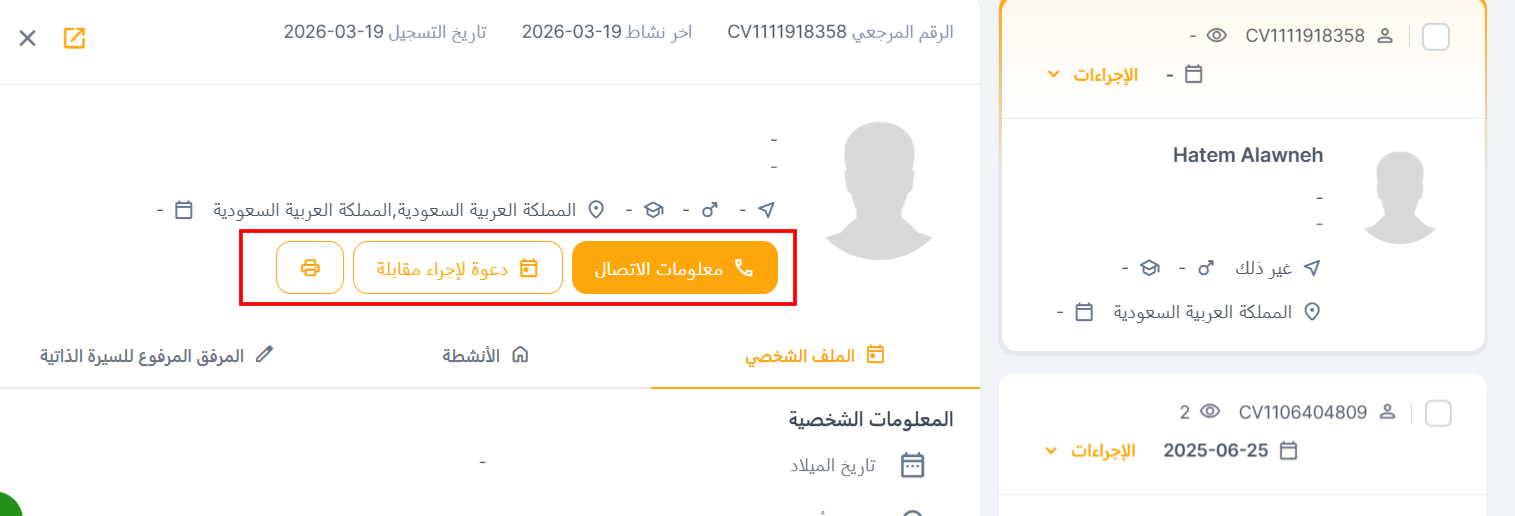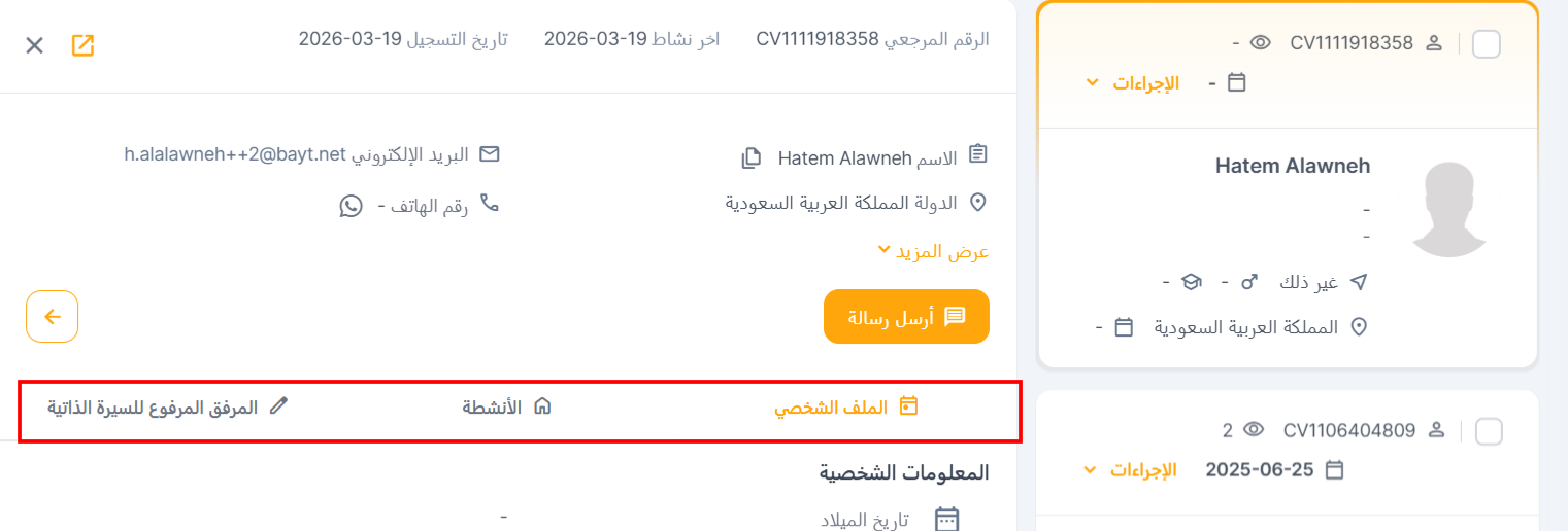- الملف الشخصي: في هذا القسم، يمكنك عرض جميع التفاصيل المتعلقة بـ المعلومات الشخصية، وخبرة العمل، والتعليم للمرشح.