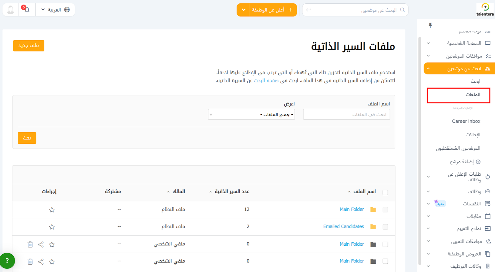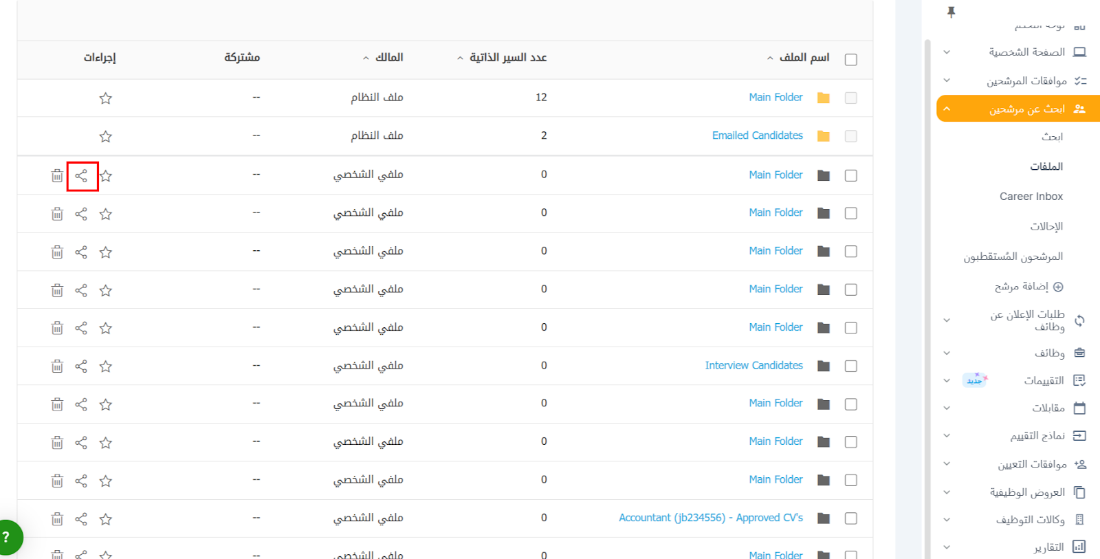 لتحسين تنظيم سير عمل التوظيف الخاص بك، يمكنك إنشاء عدة مجلدات لسهولة الوصول. يمكن مشاركة هذه المجلدات مع أعضاء الفريق الآخرين المشاركين بشكل مباشر في عملية الفحص/التوظيف.