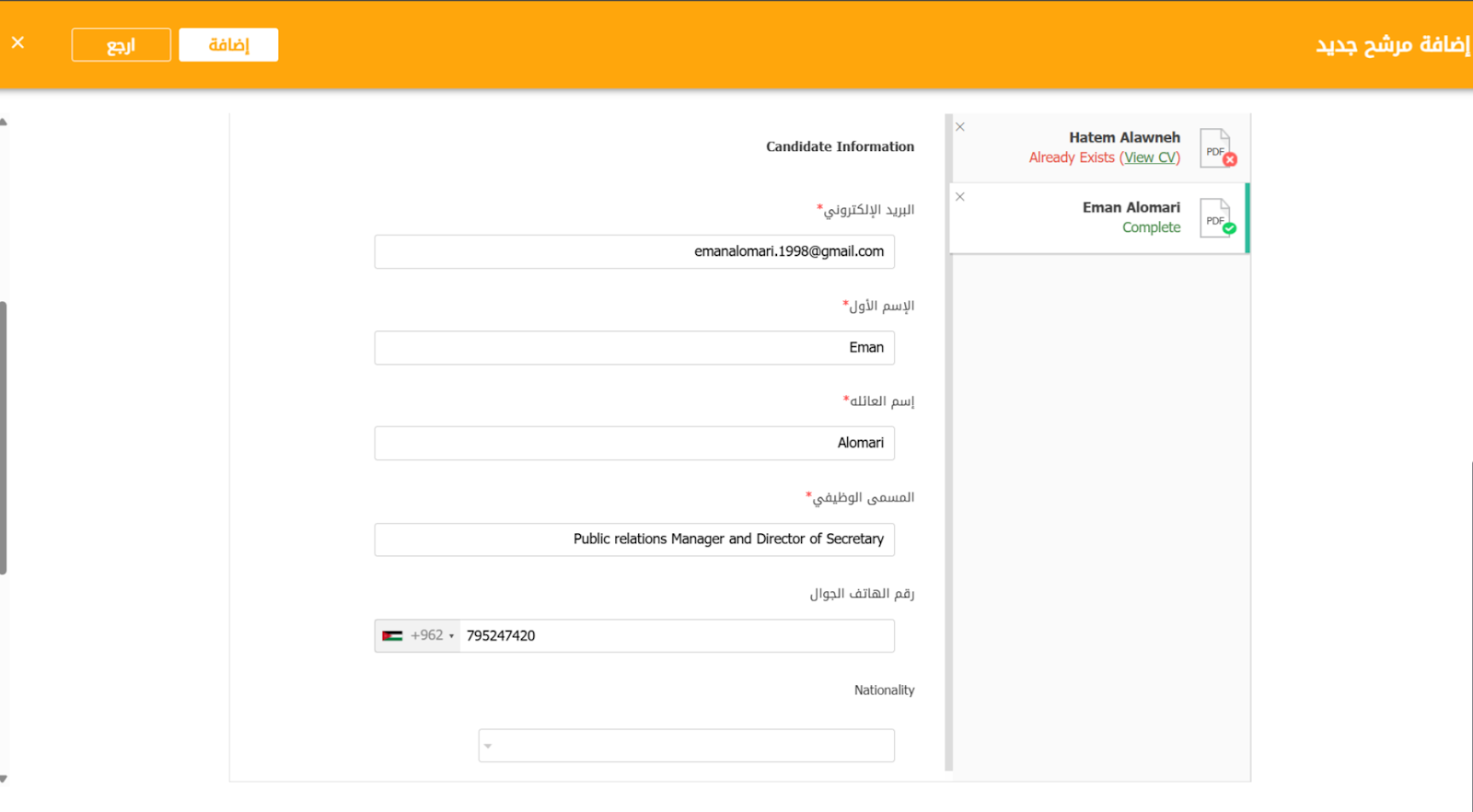 باستخدام هذا الخيار، يمكن لصاحب العمل إضافة السير الذاتية للمرشحين عن طريق تحميلها، وإضافة بعض المعلومات الضرورية مثل الاسم الأول/اسم العائلة، وما إلى ذلك، ودعوتهم لإكمال ملفهم الشخصي.