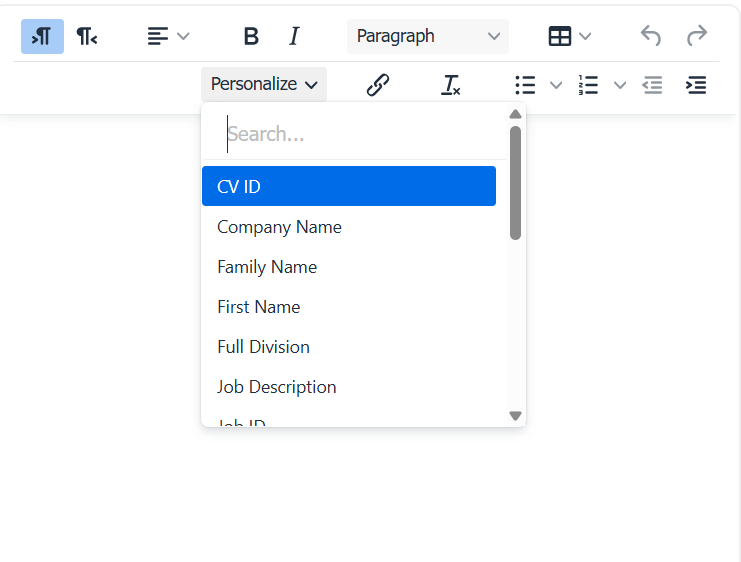 يمكنك تخصيص قالب الرسالة هذا عن طريق إضافة وحدات ماكرو مختلفة (macros) مثل معرّف السيرة الذاتية (CV ID). بهذه الطريقة، عند إرسال رسالة بشكل مجمع، لن تحتاج إلى الذهاب وتغيير معرّف السيرة الذاتية لكل مرشح في الرسالة. يقوم النظام بذلك تلقائيًا، ويتم ملء الماكرو بالتفاصيل الشخصية الخاصة بالمرشح.