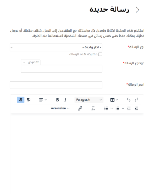 يمكن الوصول إلى الرسائل المحفوظة وإرسالها من خلال أقسام متعددة مثل البحث عن السير الذاتية، ومجلدات الإعلانات الوظيفية، والمجلدات المحفوظة، والمقابلات، بناءً على نوع الرسالة.