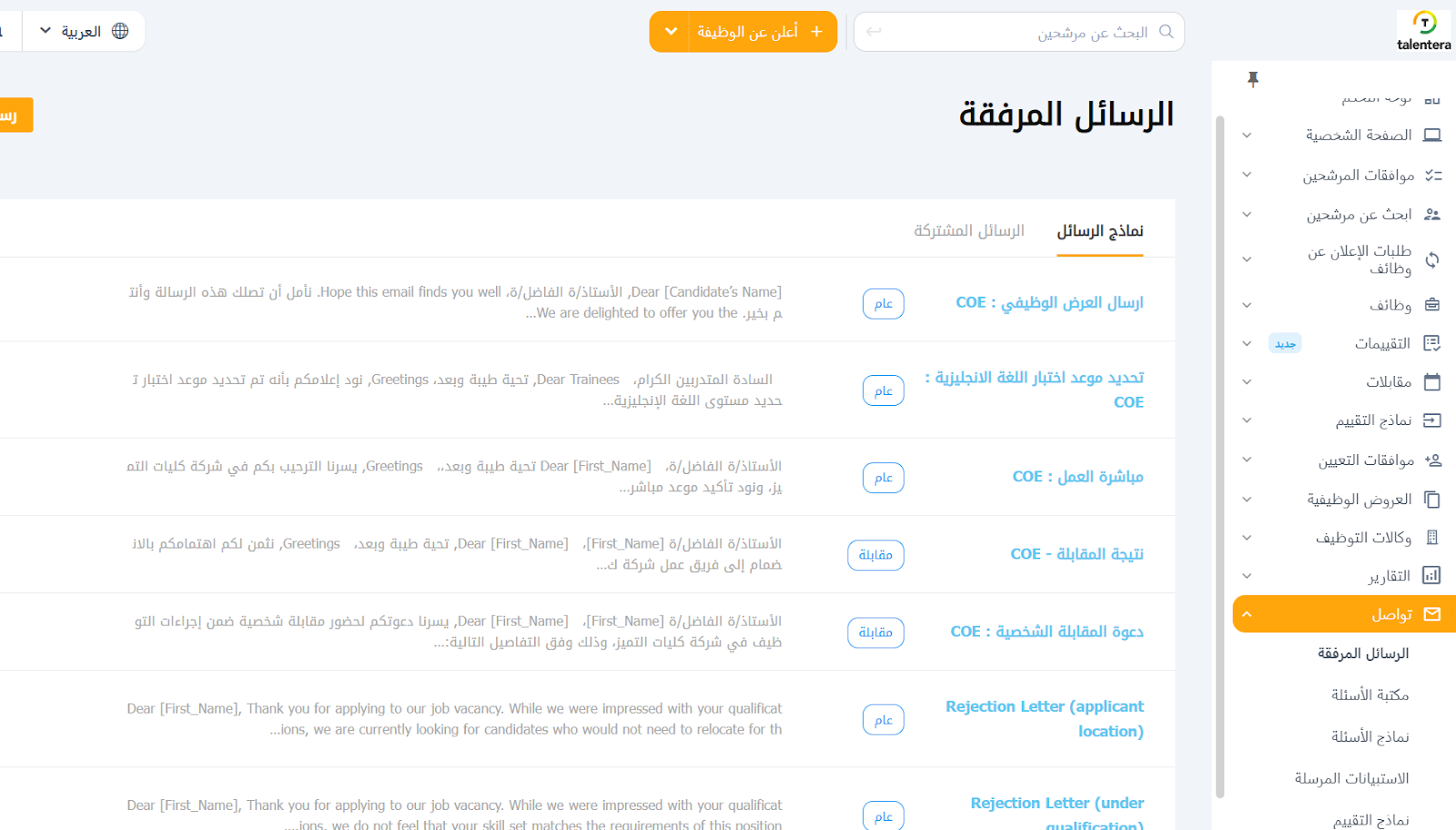 يمكن لأصحاب العمل أتمتة التواصل عن طريق إضافة قوالب بريد إلكتروني أو استخدام القوالب الافتراضية الموجودة، من خلال توفير تنسيق ومحتوى موحد للمراسلات وإرسالها إلى المرشحين.