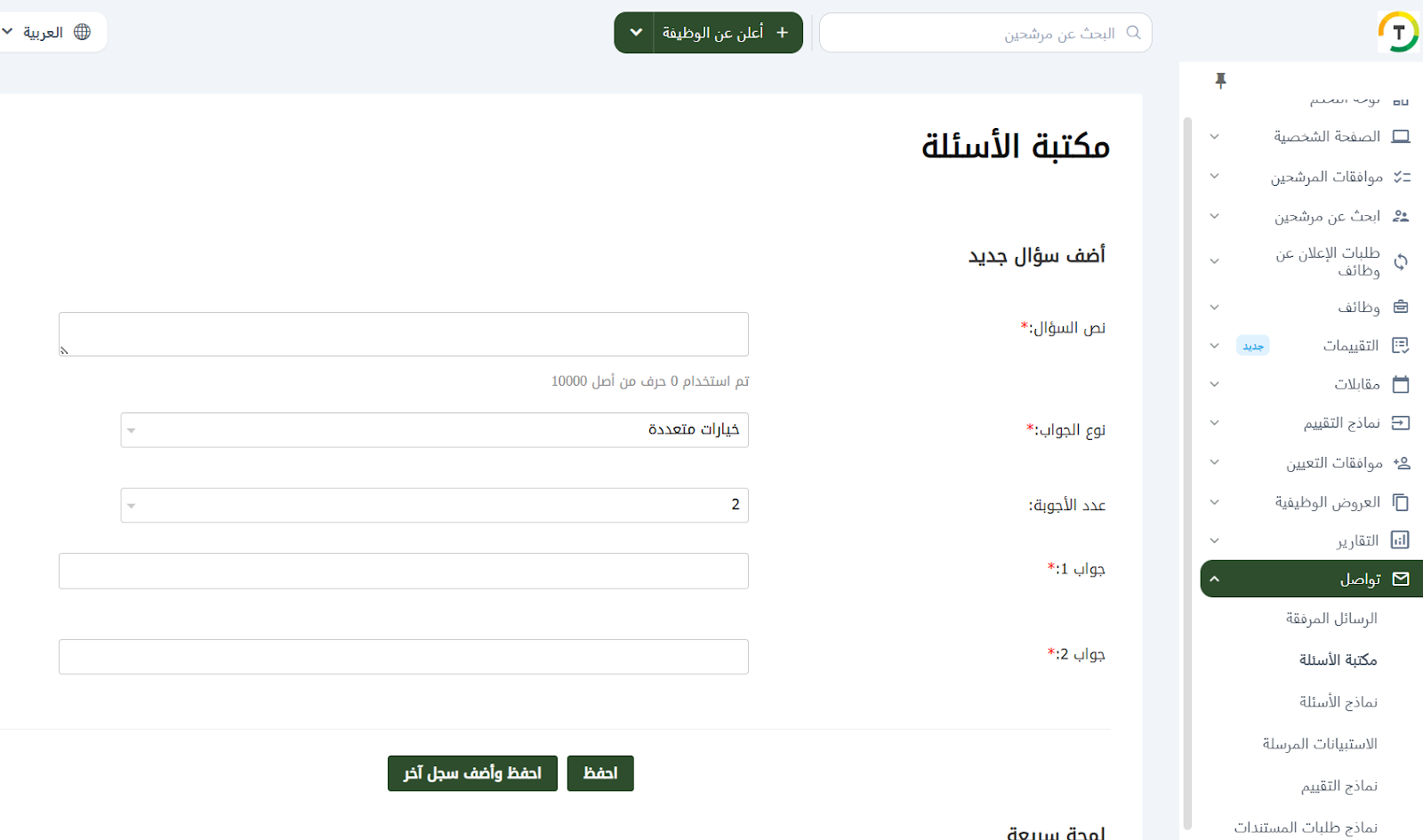 يمكن لأصحاب العمل إضافة وحفظ الأسئلة مباشرة إلى قوالب الأسئلة (Questions Templates) لاستخدامها لاحقًا في الاستبيانات المرسلة إلى المرشحين.