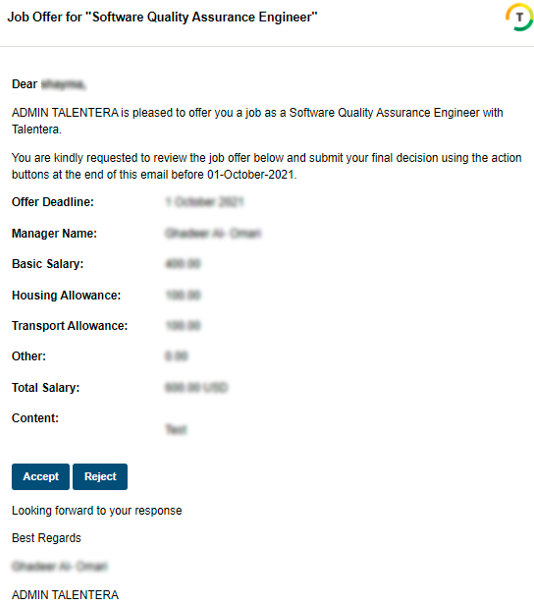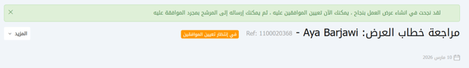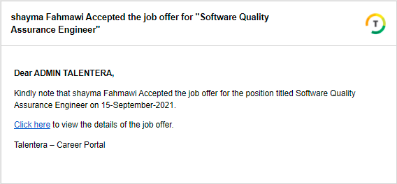 للمضي قدمًا في العرض، تحتاج إلى اختيار هذا الخيار. سيتم إرسال بريد إلكتروني إلى المرشح يتضمن تفاصيل قبول أو رفض العرض.
