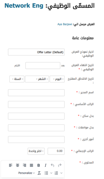 للمضي قدمًا في عملية التوظيف، وبعد الموافقة على المرشح، يقوم مدير الموارد البشرية أو مدير التوظيف بإرسال عرض عمل إلى المرشح عن طريق النقر على زر "إرسال عرض العمل" في عرض السيرة الذاتية.