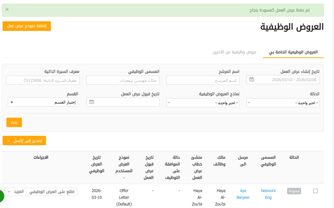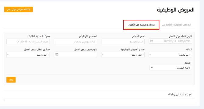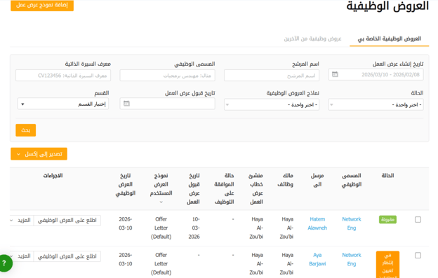 يمكنك البحث في النتائج حسب تاريخ إنشاء العرض، اسم المرشح، المسمى الوظيفي، معرف السيرة الذاتية (CV ID)، الحالة، نماذج عروض العمل، وتاريخ قبول العرض.