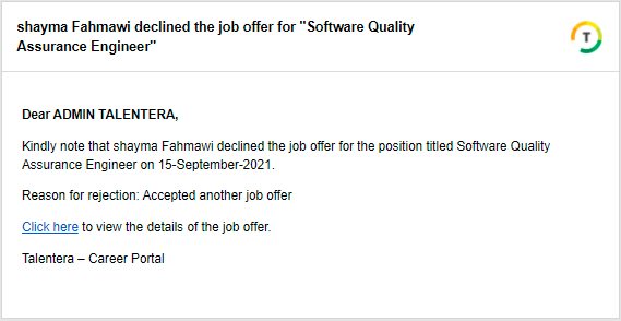 سيتم عرض رسالة التأكيد أدناه للمرشح عند الرفض وسيتلقى مدير التوظيف إشعارًا عبر البريد الإلكتروني.