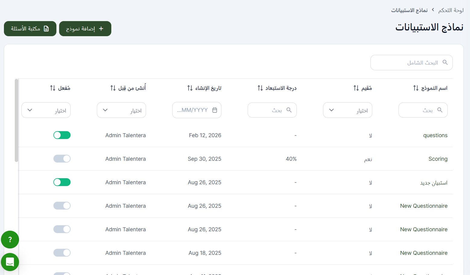 إذا كنت ترغب في إضافة سؤال آخر، فما عليك سوى النقر على “Add a new Question” (إضافة سؤال جديد). يمكن ترتيب الأسئلة عن طريق السحب والإفلات إلى الموضع المناسب. بمجرد إضافة جميع الأسئلة، انقر على ‘Save & Exit to Questionnaire Templates’ (حفظ وخروج إلى قوالب الاستبيانات). إذا كنت ترغب في البدء باستخدام هذا الاستبيان، فما عليك سوى النقر على ‘Activate’ (تفعيل).
