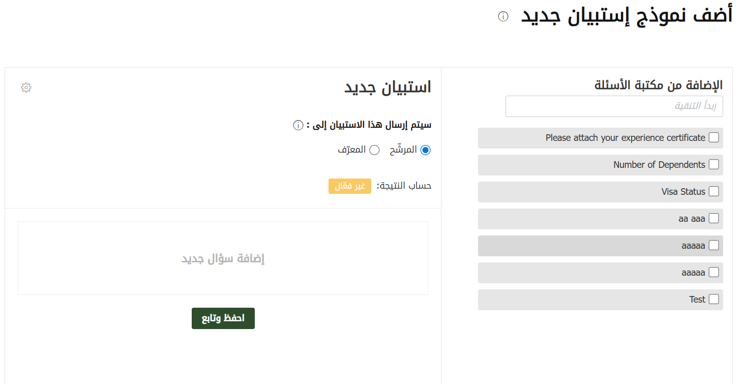 يمكنك إنشاء قالب استبيان بالنقر على ‘Add a New Questionnaire’ (إضافة استبيان جديد). حدد اسم الاستبيان وأي تعليمات للمرشحين (إذا وُجدت).